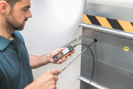 Nutzen Sie die HitzdrahtSonde, um Strömungsgeschwindigkeit; Volumenstrom und Lufttemperatur mit dem passenden testo Multifunktionsmessgerät (bitte separat bestellen) zu ermitteln. HitzdrahtSonde – Ausstattung Mit dem fest angeschlossenen Kabel verbinden Sie die HitzdrahtSonde mit dem Messgerät. Die Sonde ist mit einem Teleskop ausgestattet, das im ausgefahrenen Zustand eine maximale Länge von 0,85 m hat. Um genaue Messergebnisse sicherzustellen, erfolgt eine Kompensation der Luftdichte über die integrierte Absolutdruckmessung. Das klar strukturierte Messmenü für Volumenstrom sorgt für eine intuitive Bedienung des Messgeräts. Dank komfortabler Eingabe von Dimension und Geometrie des Kanalquerschnitts wird der Volumenstrom exakt berechnet. Zeitliche und punktuelle Mittelwertbildung, durchschnittlicher Volumenstrom, aktueller Messwert sowie Min/MaxWerte werden im Messgerät angezeigt. Integrierter Sensorschutz: Wenn Sie die HitzdrahtSonde nicht im Einsatz haben, schützt die drehbare Schutzkappe den Strömungssensor vor Schmutz und mechanischer Belastung. Intelligentes Kalibrierkonzept Mit der digitalen Sonde profitieren Sie von besonders präzisen Messergebnissen, da die Messunsicherheit vom Messgerät entfällt. Zur Kalibrierung schicken Sie nur die Sonde ein – so bleibt das Messgerät durchgehend im Einsatz. Anwendungsgebiete der HitzdrahtSonde Lüftungskanäle: Mit der HitzdrahtSonde messen Sie zuverlässig Strömungsgeschwindigkeit und Lufttemperatur in Lüftungskanälen. Profitieren Sie von einer schnellen Berechnung des Volumenstroms: Im Messmenü „Volumenstrom“ des passenden Messgeräts (bitte separat bestellen) konfigurieren Sie Dimension und Geometrie des Kanalquerschnitts – das Messgerät zeigt Ihnen direkt den Volumenstrom an.