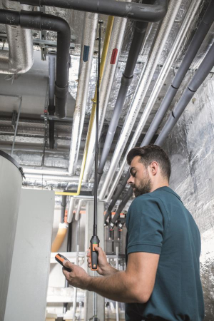 Nutzen Sie die HitzdrahtSonde, um Strömungsgeschwindigkeit; Volumenstrom, Lufttemperatur und Luftfeuchtigkeit mit dem passenden testo Multifunktionsmessgerät (bitte separat bestellen) zu ermitteln. HitzdrahtSonde mit Bluetooth inkl. Temperatur und Feuchtesensor – Ausstattung Über Bluetooth werden die Messwerte der HitzdrahtSonde bis zu einer Entfernung von 20 m an Ihr Messgerät übertragen. Die HitzdrahtSonde ist mit einem Teleskop ausgestattet, das im ausgefahrenen Zustand eine maximale Länge von 1,0 m hat. Die Eintauchtiefe lässt sich dank der kontraststarken Skalierung auch bei schlechten Sichtverhältnissen gut ablesen. Das klar strukturierte Messmenü für Volumenstrom ermöglicht die intuitive Bedienung des Messgeräts. Dank komfortabler Eingabe von Dimension und Geometrie des Kanalquerschnitts wird der Volumenstrom exakt berechnet. Zeitliche und punktuelle Mittelwertbildung, durchschnittlicher Volumenstrom, aktueller Messwert sowie Min/MaxWerte werden im Messgerät angezeigt. Besonders praktisch: Betätigen Sie die Taste an der HitzdrahtSonde und bedienen Sie das Messgerät. Beispielsweise zum Speichern einzelner Messwerte für die punktuelle Mittelwertbildung oder auch, um Messreihen für die zeitliche Mittelwertbildung zu starten und zu stoppen. Integrierter Sensorschutz: Wenn Sie die HitzdrahtSonde nicht im Einsatz haben, schützt die drehbare Schutzkappe den Strömungssensor vor mechanischer Belastung. Kabellos und platzsparend: mehr Anwendungen, weniger Equipment Grenzenlos vielseitig: Ein universell einsetzbarer Handgriff lässt sich mit sämtlichen Sondenköpfen verbinden – so meistern Sie mehr Anwendungen mit weniger Equipment und sparen Platz. Der BluetoothHandgriff sorgt für mehr Komfort bei Ihrer Messung und weniger Kabelgewirr im Koffer. Oder bestellen Sie zum Anschluss von testo Sondenköpfen den KabelHandgriff. Das ist von Vorteil, wenn BluetoothSignale nicht erlaubt sind. Müssen die Sensoren (Strömung; Temperatur, Feuchte) in ferner Zukunft getauscht werden, können Sie den Sondenkopf auswechseln. Statten Sie die HitzdrahtSonde bei Bedarf zusätzlich mit der TeleskopVerlängerung (separat bestellbar) aus. Damit erreichen Sie eine Gesamtlänge von 2 Metern und messen bequem an großen Lüftungsanlagen. Intelligentes Kalibrierkonzept Mit der digitalen Sonde profitieren Sie von besonders präzisen Messergebnissen, da die Messunsicherheit vom Messgerät entfällt. Zur Kalibrierung schicken Sie nur den Sondenkopf ein – so bleibt das Messgerät durchgehend im Einsatz. Anwendungsgebiete der HitzdrahtSonde mit Bluetooth Lüftungskanäle: Mit der HitzdrahtSonde messen Sie zuverlässig Strömungsgeschwindigkeit; Lufttemperatur und Luftfeuchtigkeit in Lüftungskanälen. Da der Messbereich bis +50 m/s reicht und die Gesamtlänge der Sonde auf 2,0 m erweitert werden kann (TeleskopVerlängerung bitte separat bestellen), sind auch Messungen an großen Lüftungsanlagen möglich.