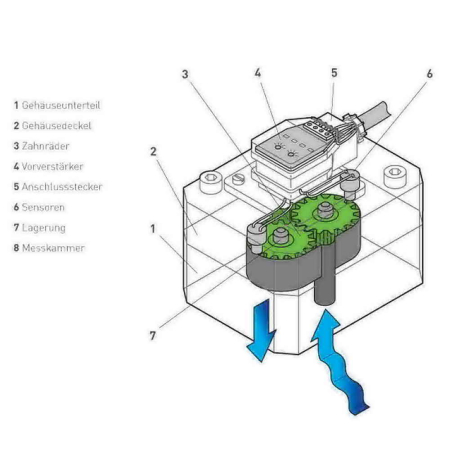 Ein sehr präzise eingepasstes Zahnradpaar innerhalb des Gehäuses bildet das Messwerk. Das einströmende Medium setzt das Zahnradpaar in Rotation. Die Drehbewegung wird durch Sensoren berührungslos abgetastet. Da jeder einzelne Zahn einen Impuls erzeugt, ergibt sich eine sehr hohe Auflösung. Somit können selbst kleinste Volumina exakt gemessen oder dosiert werden.